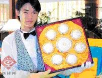 翻开饼盒是第一层,7个小月饼簇拥在一个大月饼周围,月饼用镀银的不锈钢盒装;第二层是一个银碟和两把金刀叉,闪闪发光,旁边还有一本装潢讲究的关于中秋的书。“第一盒”的“仪表”亮丽,月饼的内容也不赖——用鲍鱼、鱼翅制成,其他用料也精心选择。