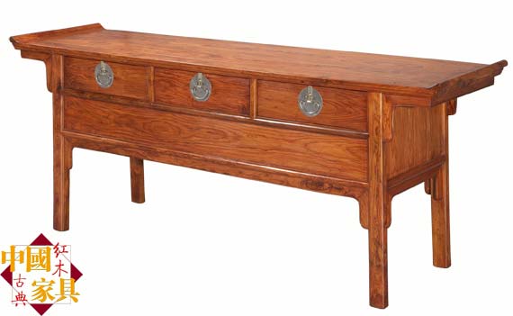 本款素身联三橱制作于11年前,是伍氏兴隆1996年的作品,目前市场上比较少见,现珍藏于伍氏兴隆家具艺术典藏馆内。此橱由海南黄花梨制成,具有典型的明式风格及特点,长212厘米、深56厘米、高87厘米;设计上采用案形结体,面板两端微翘,面下设三屉,装白铜饰件,尤其是腿材,外圆内方,沿边缘起阳线,牙条素直。整体造型爽朗简洁、韵味儒雅周正,在材质与纹理搭配上颇具匠心,整案木色看上去瑰丽而协调,深具一木一器之妙意。