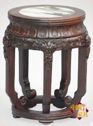 此凳参照清宫旧藏“紫檀水龙纹海棠凳” 之意蕴改制而成。经审慎构思,改制为圆形镶大理石面,五足圆凳、圆台一套。此凳打洼高束腰,雕蕉叶纹,牙条与腿上截均浮雕水龙纹,腿足卷云纹下承托泥。纹饰疏密有致,刀法流畅精严,风格圆浑肃穆,为精心改良设计之作。