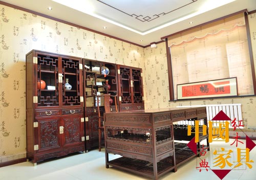 从展厅的风格来说,绝对是居家过日子的典型陈设。长长的走廊透露出传统的古典韵味,走廊两边根据需求的不同安排了不同的房间。卧室家具的装配典雅气质,其中有红酸枝山水大床、顶箱柜、五斗柜等常用家具,米色的窗帘与红色的家具搭配恰到好处,家的温馨感油然而生,暖从心来。两盆绿植的点缀给房间增加了不少灵动气息,万“红”丛中一点绿。