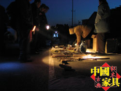 吃过水饺,再到街上,人已多起来了,商贩开始忙着铺地摊,摆东西,很多大瓷瓶也摆出来了,也有人拿着手电开始看东西。笔者也抄着手电,随着大家一个摊一个摊挨着看,瓷器、玉器、铜器、书画、文房用品、木器等等,东西还真不少。还有不少操着京、津或南方口音,背着大包,手提强光应急灯的“虫儿”,不一会,笔者还在探头探脑的时候,他们手里就拎上了个铜灯笼,或是挎把长刀,已经有收获了,其中也不乏女性。