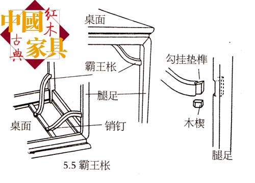 霸王枨是明清家具中一个部件的名称。霸王枨乃举臂擎天之意,霸王枨上端托着桌面的穿带,并用梢钉固定,其下端则与足腿靠上的部分结合在一起。古人为了不让桌面下的横枨影响腿脚的活动,而设计出这种特殊的结构部件来取代横枨的固定作用。霸王枨可把桌面承受的重量更均衡地传递到腿足上来,既可帮助牙板固定四腿,同时也对桌面的穿带起支撑作用。