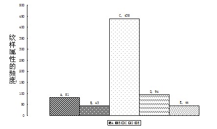 上图显示装饰符号中单独纹样占符号总数的63%,其次频率由高至低为边框纹样、连续纹样、角隅纹样、适合纹样,边框纹样与连续纹样频率接近,角隅纹样与适合纹样频率接近。